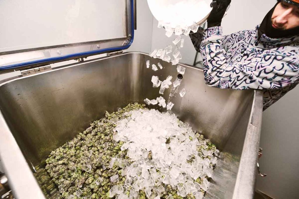 This is where the magic begins. The frozen flower is gently agitated in ice-cold water, causing trichome heads to separate from the plant material. Those trichomes are collected using micron filter bags, each capturing different sizes for purity and flavor.